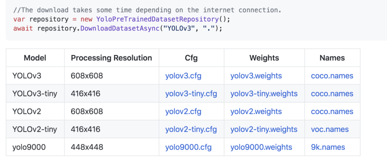 pre-trained dataset을 사용하실려면 YOLOv2-tiny같은 경우는 누겟패키지에 Alturos.YoloV2TinyVocData패키지로 있으니 설치해서 쓰면 되고 다른것들은 직접 다운로드해서 쓰시던가 아래처럼 코드에 넣어서 자동으로 받게 해도 됩니다.
