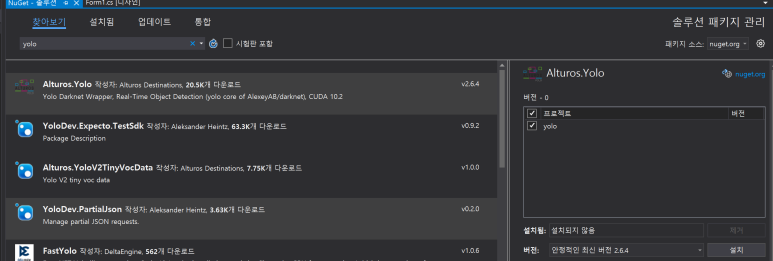 누겟패키지로 Alturos.yolo를 설치하고 다른 영상처리도 같이하기 위해 opencv sharp도 설치합니다.(카메라 연동 등등을 위해) opencv sharp 에 대해 잘 모르시는 분들은 전 장을 참고하시기 바랍니다.