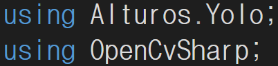 Alturos.YoloV2TinyVocData패키지를 설치해서 스면 yolov2-tiny로 그냥 오토매틱하게 쓰는데 다른걸 쓰려면 아래처럼 yoloWrapper() 선언할때 써줘야 된다.