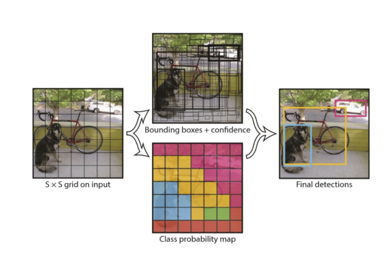 이 방식은, 입력이미지를 SxS 그리드 영역으로 나누고, 이 그리드영역에서 객체가 있을만한 영역에 해당하는 N개의 바운딩 박스를 예측한다음 해당 박스의 신뢰도(confidence) 를 계산합니다. 계산 방법은 해당 그리드에 객체가 있을 확률 Pr(Object)와 Ground Truth의 겹치는 영역의 비율을 나타내는 IOU를 곱해서 계산합니다.