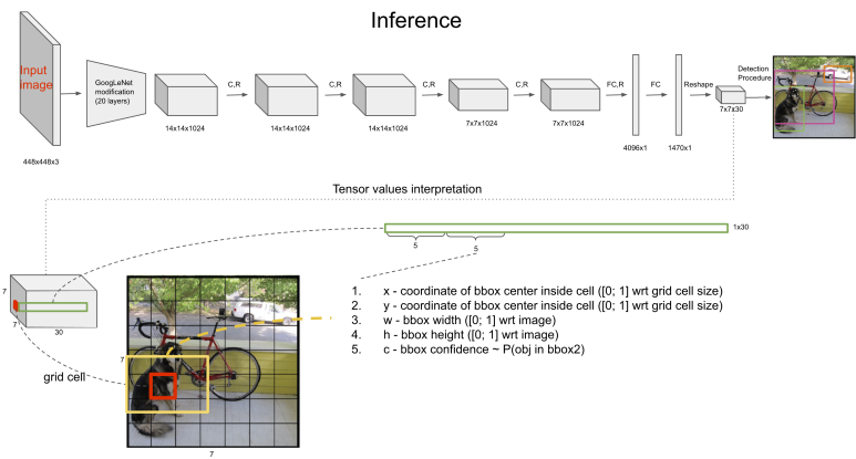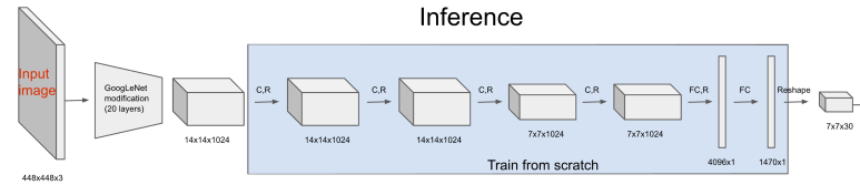 위의 도식표를 보면 알겠지만, 448x448로 된 3채널의 이미지를 입력받은 다음 Googlenet의 modification한 20개의 레이어는 고정한다음 마지막 4개의 레이어만 object detection 레이어에 맞게 학습을 시키는데