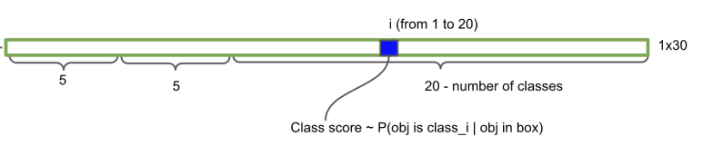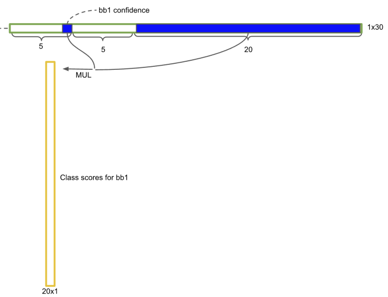 이것을 어떻게 계산하나면 앞에 말한 곱셈 연산으로 계산되는데 즉 박스의 신뢰도와 이 20차원백터의 값을 곱하게 되면 특정클래스일 값이 되는 것입니다.