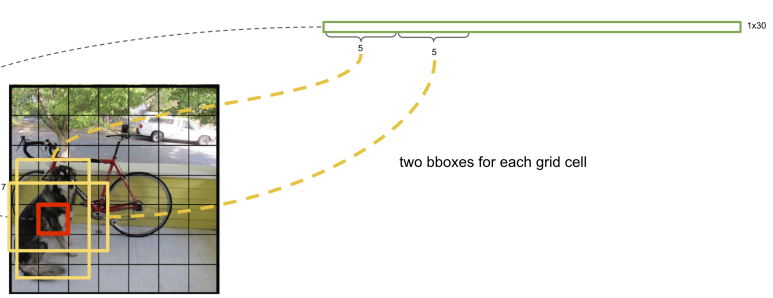 30개의 차원 벡터안을 세부적으로 보자면, 5개씩 2개의 차원에는 각각 그리드의 좌표와 너비 높이 그리고 신뢰도값이 저장되고,