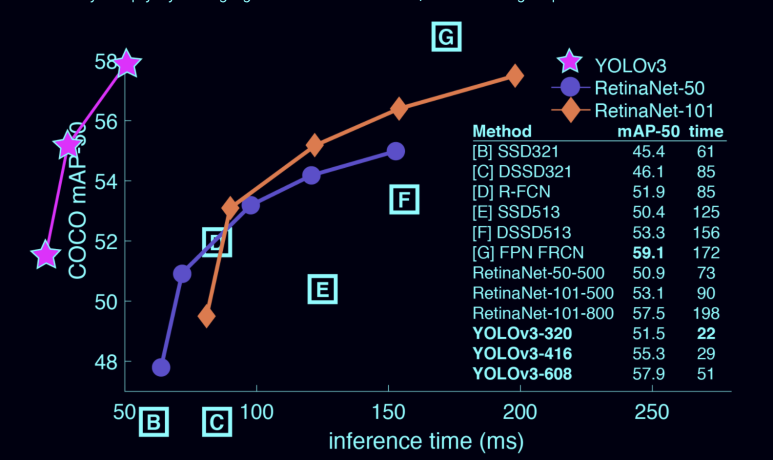 You only look once 의 줄임말로 어마어마하게 빠른시간으로 실시간 object detection 으로써, 엔비디아의 파스칼 타이탄X 그래픽카드(GPU) 기준으로 COCO 테스트 데이터에서 30FPS로 무료 mAP가 57.9%를 기록했다.