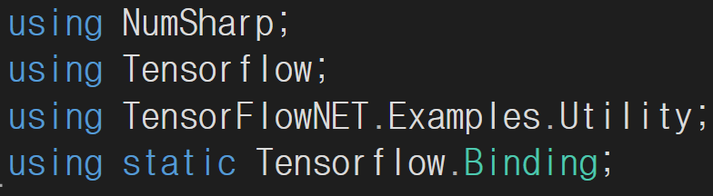 그 다음 라이브러리를 사용하기 위해 using을 사용해서 텐서플로우 닷넷 라이브러리들을 로딩합니다.
