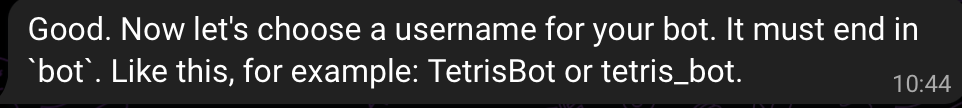 2. 봇의 사용자 이름 정하기 (꼭 _bot으로 끝나는 이름으로 만들어줘야된다.)