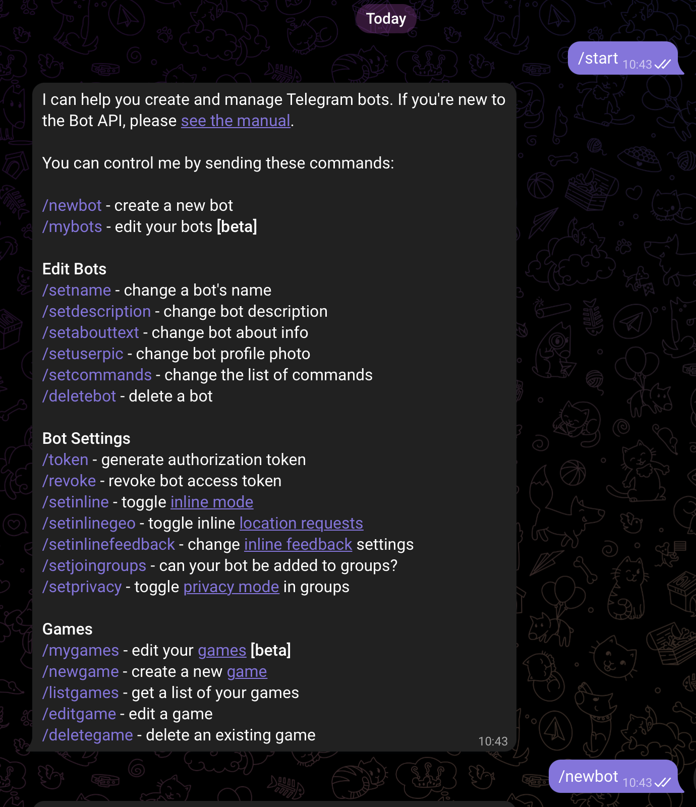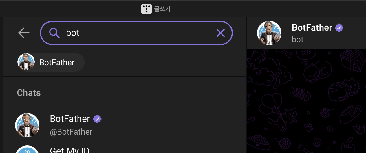 1번의 경우 위의 t.me/봇의사용자이름 클릭하면 창이 뜨는데 그거 시작하고 메세지를 보내보고.