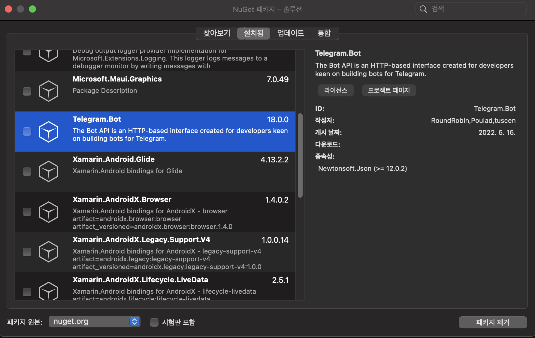 maui 메인 .cs에서 우선 텔레그램 봇 패키지를 추가해주고.