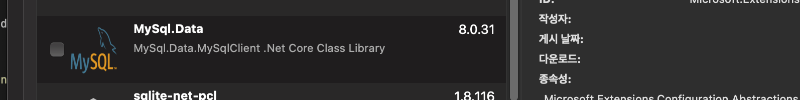 mysql.data 패키지를 찾아서 설치해준다.