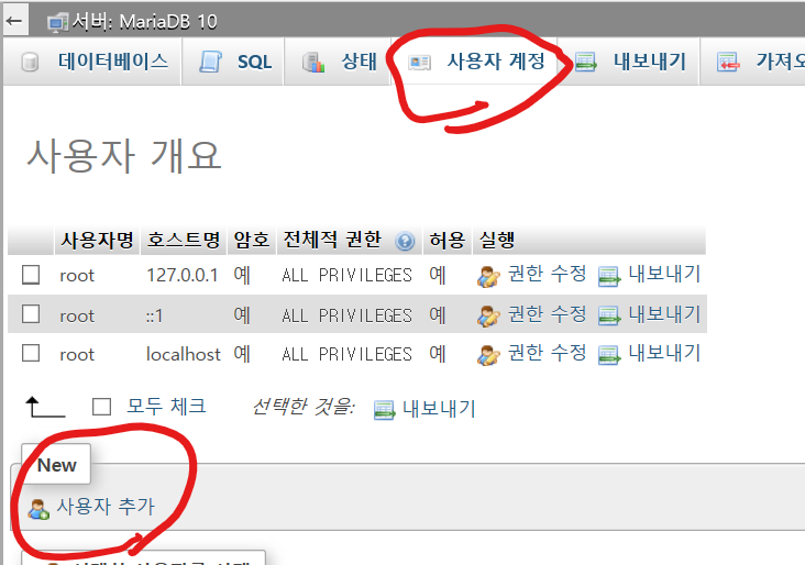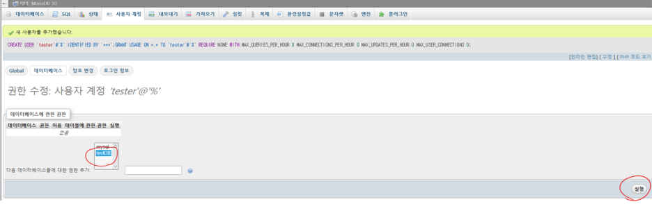 권한을 줄 데이터베이스 선택하고 실행하면 해당 데이터베이스만 제어가능한 계정이 된다.