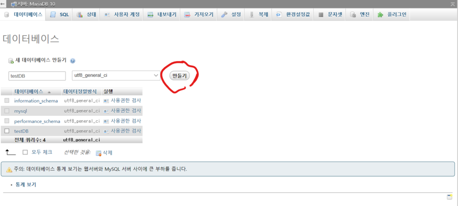 데이터베이스명에 만들 db이름을 입력하고 만들기 버튼 클릭.