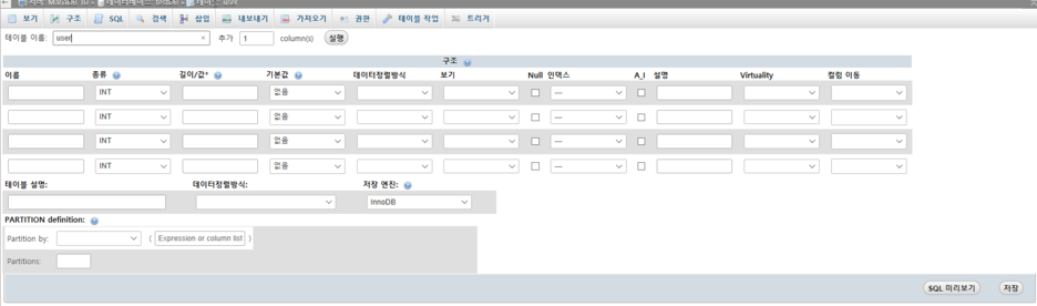 테이블 만들기에서 이름 넣고 실행하면 만들어진다.