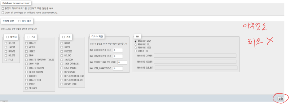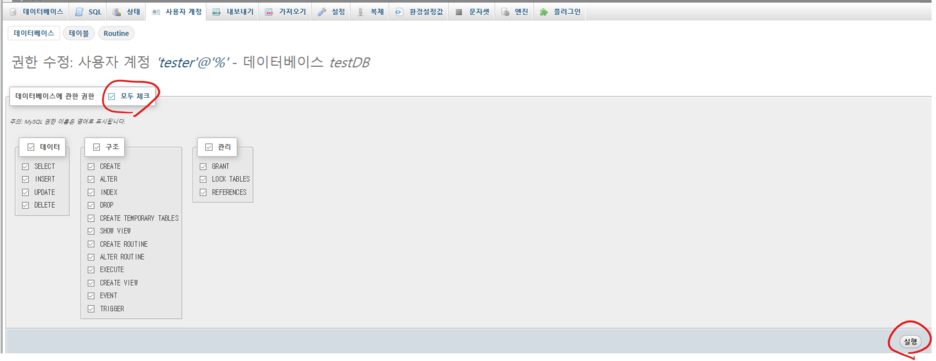 이제 그 해당 데이터베이스에서 권한 설정. 그 데이터베이스에서 만큼은 관리자이고싶으면 모두체크하면 된다.
