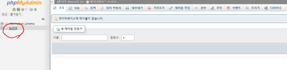 이제 데이터베이스에서 테이블 생성. 먼저 아까 권한 준 DB선택