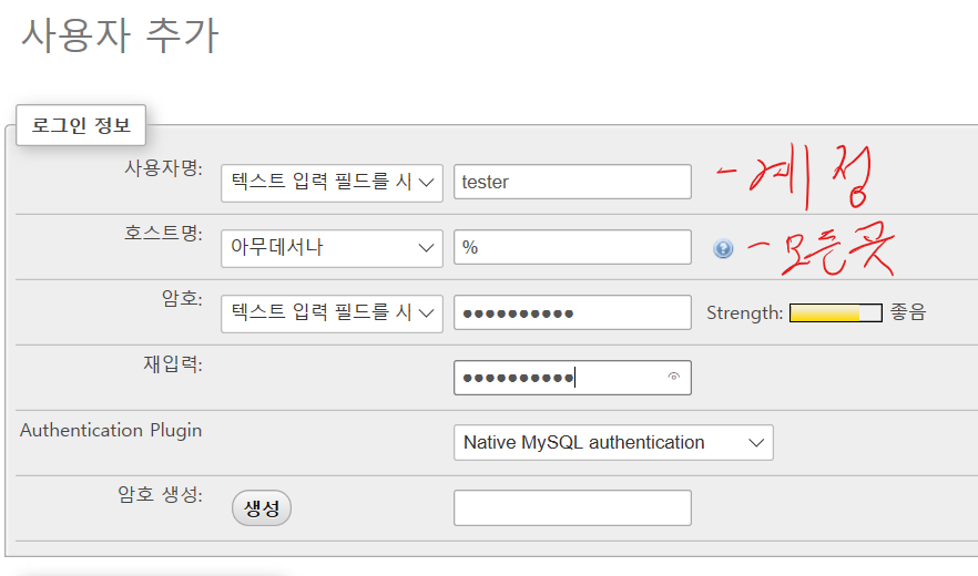 그 다음 해당되는 데이터베이스만 관리할 사용자 계정생성.