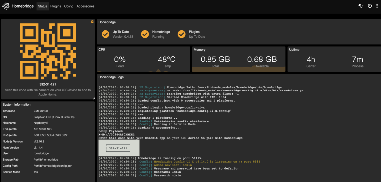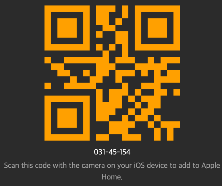 으로 접속하면 아래와 같이 창이 뜨는데 왼쪽 상단위에 qr코드를 애플 홈킷에다가 등록하면 홈브릿지에 연결해놓은 장비들이 모두 애플홈킷에 등록이 된다