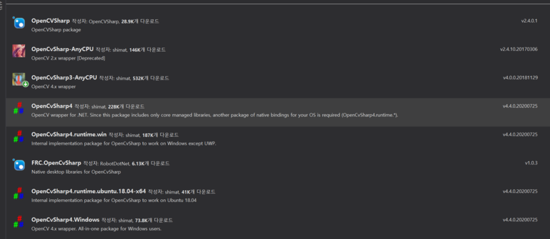 도구-> nuget패키지 관리자 -> 솔루션용 nuget패키지 관리에서 opencvsharp을 찾아서 설치.
