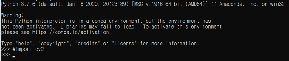 python이라고 실행한뒤에 위에 처럼 #import cv2 했을때 아무런 에러가 나지않으면 정상적으로 설치가 된것입니다.