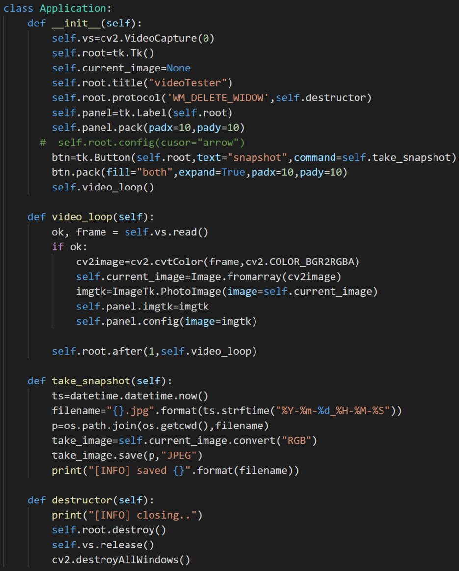 간단하게 코딩에 설명하자면 tkinter로 돌아가는 클래스를 생성하는데 카메라에서 영상을 받아서 cv2로 받아서 bgr칼라 순으로 되어있으므로 rgb로 변환해서 화면을 봐야 우리가 실제 색상대로 받을수 있다.