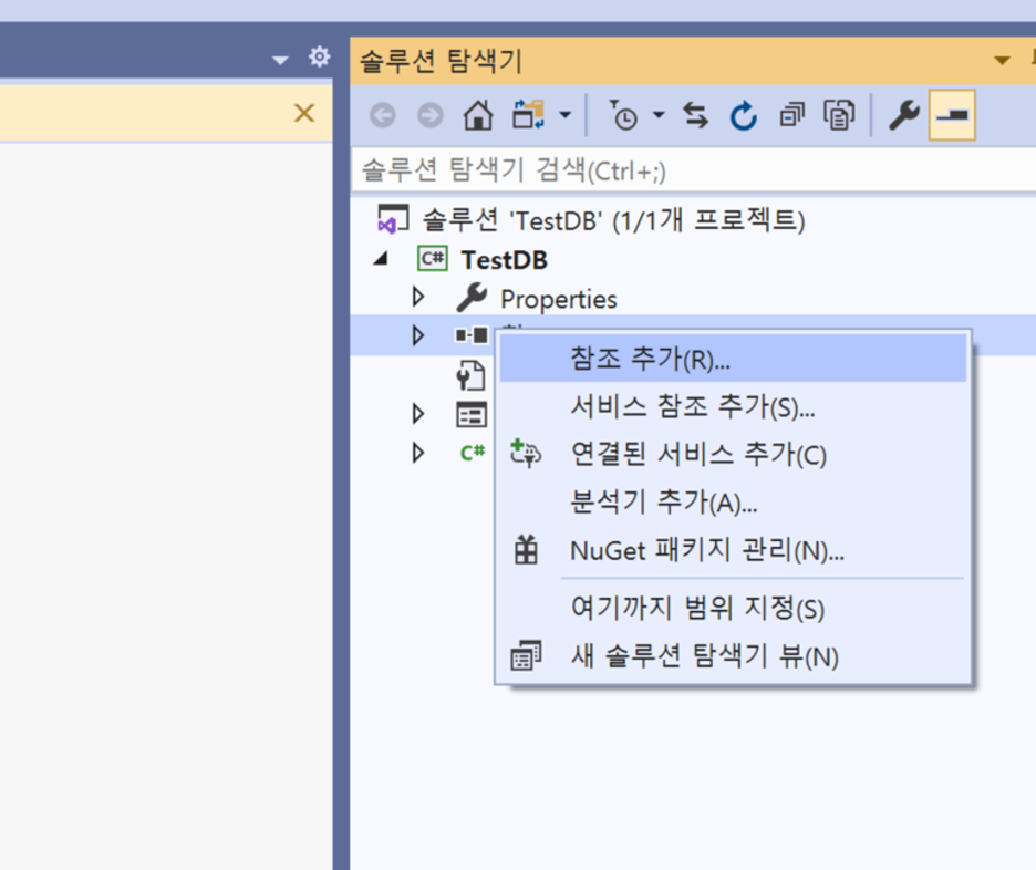 프로젝트가 생성되는데 이 프로젝트의 솔루션 탐색기에서 참조추가로 mysql.data를 추가해주면 이제 커넥터가 연결된 것이다. 아래 그림 참조할것.
