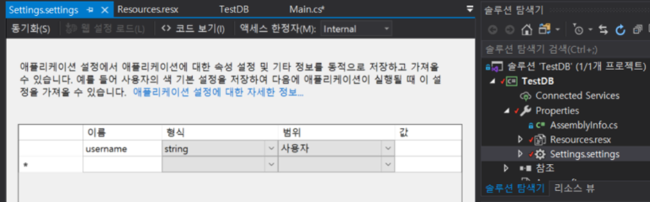 위에 처럼 솔루션 탐색기에서 Settings.settings파일에서 등록해주면 되고.